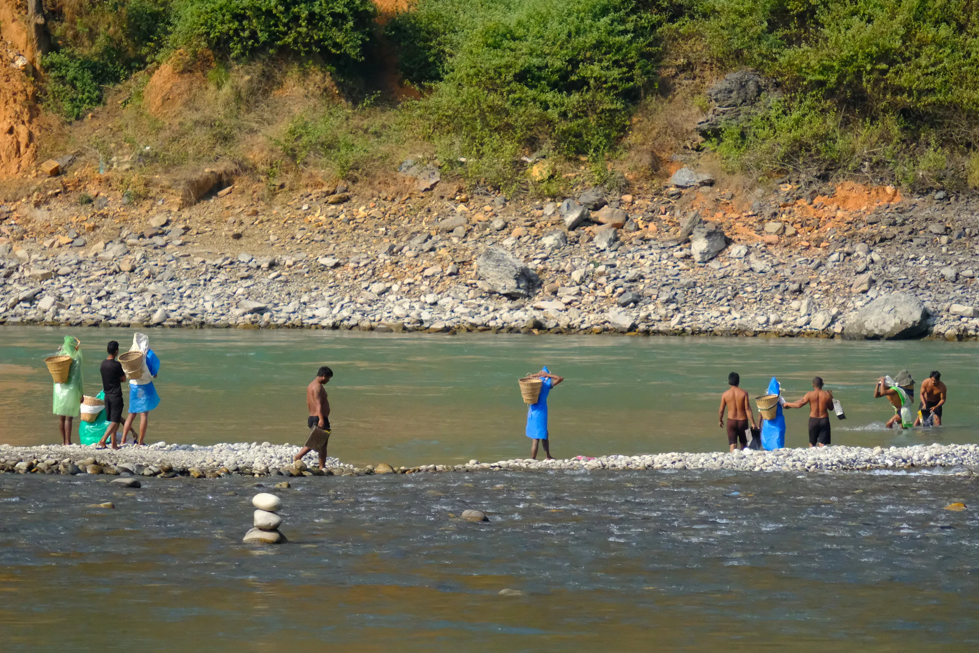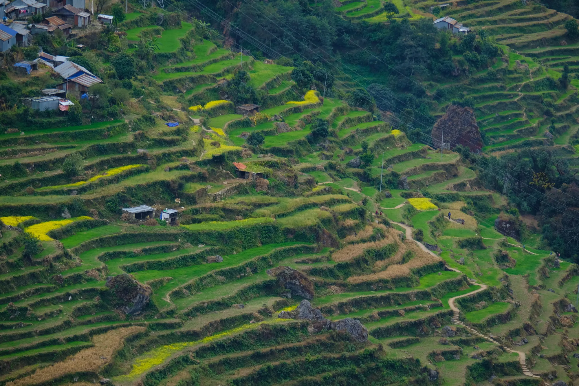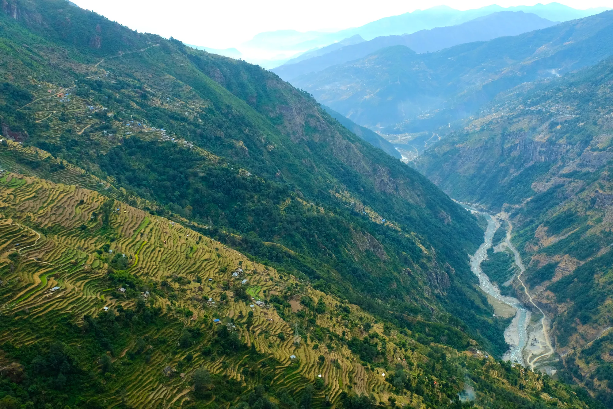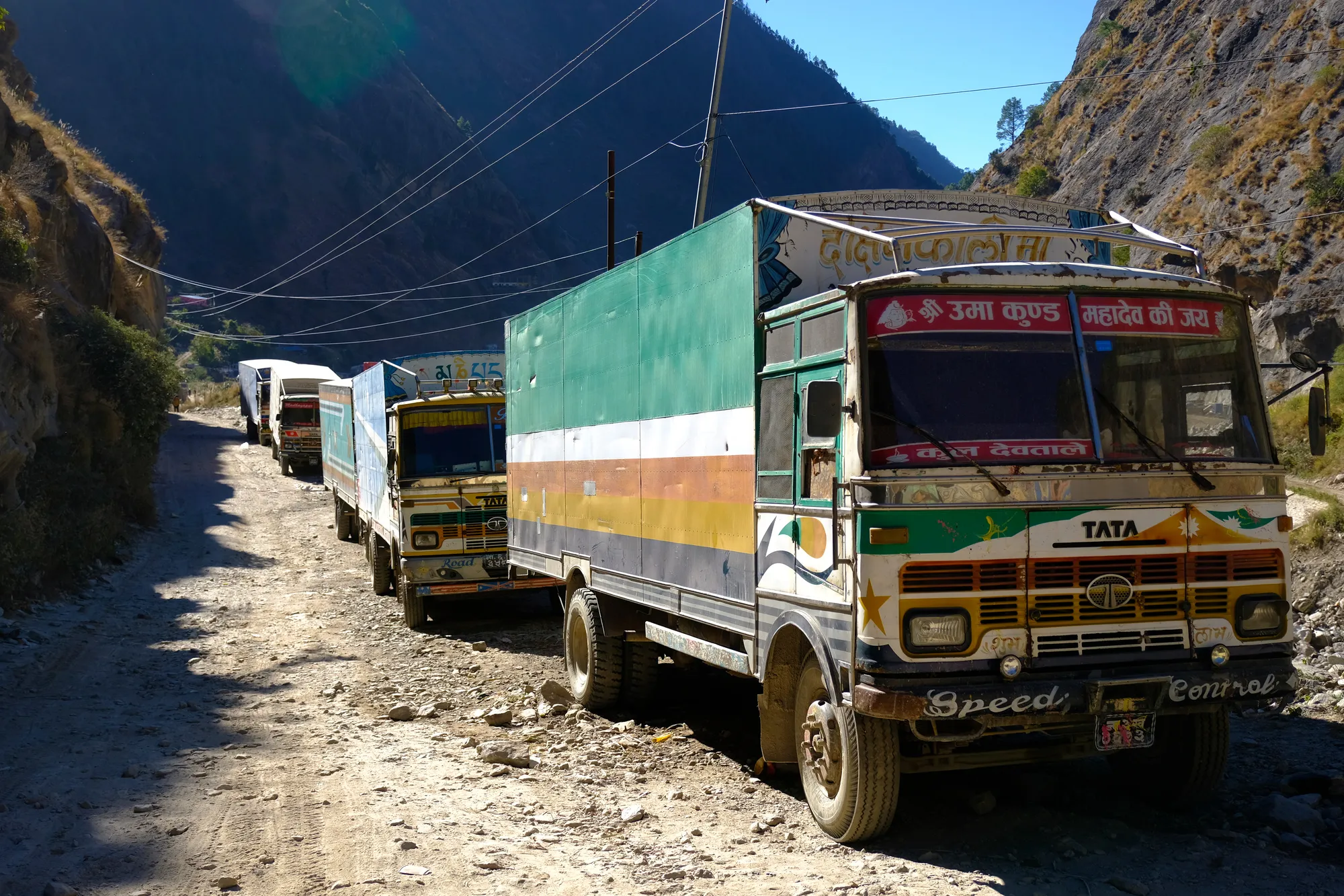 Nach dem Grenzübertritt geht es nur noch bergab - topografisch auf jeden Fall. Während Tibets Hochgebirgslandschaft karg und trocken war, ist es in Nepal grün und warm. Nach ausgedehnten Nadelwäldern wird es schnell subtropisch und wir staunen nicht schlecht, als plötzlich Bananen- und Papayabäume die Strassenränder säumen. Die gut ausgebaute chinesische Strasse weicht nach der Grenze einer holprigen Schotterpiste und der Verkehr wird lauter und bunter. Alte, farbig bemalte Lastwagen schlängeln sich qualmend und hupend durch die kurvigen Bergstrassen. Die Menschen erinnern mit ihrer Kleidung und der Tika (roter Punkt) auf der Stirn stark an Indien. Haben wir etwa ein Land übersprungen? Bald müssen wir feststellen, dass unsere Vorstellungen über Nepal wohl nicht ganz mit der Realität übereinstimmen. Da wir im Vorfeld nur wenig Zeit hatten, uns mit diesem Land zu befassen, kamen wir mit der naiven Idee, dass Nepal mit seinen bekannten 8000ern ein Bergland sei. Der Jahreszeit entsprechend haben wir zumindest in gewissen Regionen Schnee erwartet und uns (vor allem Janosch!) darauf gefreut, hier ein paar tolle Skitouren zu machen. Doch dem war nicht so. Der Schnee ist nur in extremen Höhen zu finden und Skitouren mit riesigem Aufwand verbunden. Wir lernen, dass Nepal unglaublich divers ist und dank verschiedenen Klimazonen Hochgebirgslandschaften mit Schneeleoparden, aber auch subtropische Wälder mit Panzernashörnern umfasst.