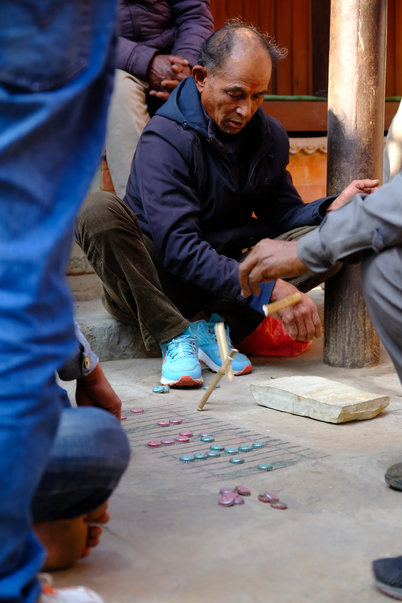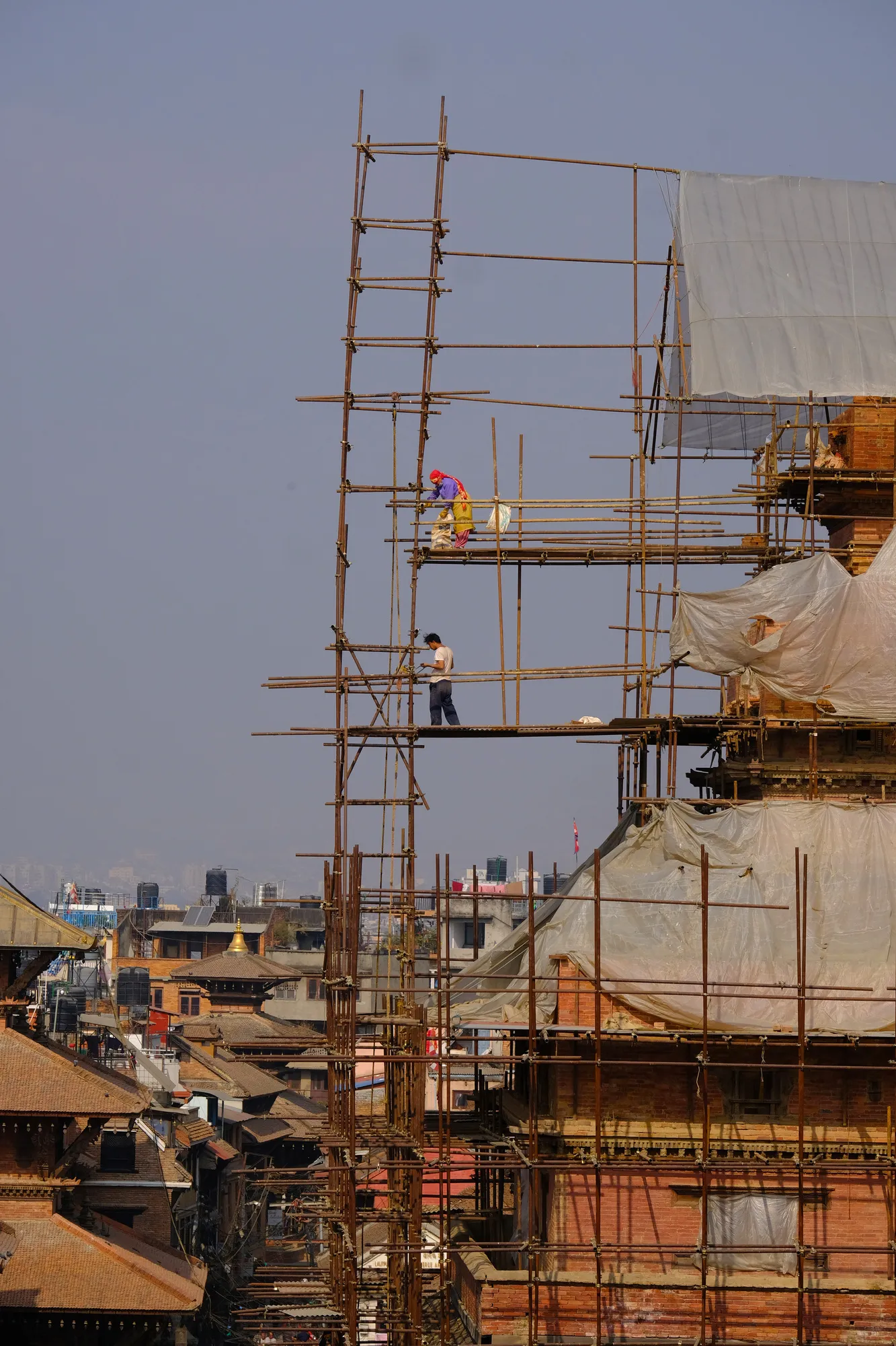 Erholt fahren wir weiter nach Kathmandu und tauchen ein ins Getümmel von Nepals Hauptstadt. Die Strassen sind laut, überfüllt und stressig. Es wuselt nur so von Mopeds, die einen immer und überall in den gefährlichsten Momenten überholen können. Mit unserem Büssli durch die teils engen Gassen zu navigieren ist anspruchsvoll und wir sind froh, am Ende des Tages niemanden überfahren zu haben. Von der auf einem Hügel gelegenen Swayambhunath-Stupa aus erhalten wir einen guten Überblick über die 2.9 Millionen-Metropole. Die sich eigentlich im Hintergrund erstreckende Himalaya-Kette bleibt hinter der dicken Smog-Glocke verborgen.