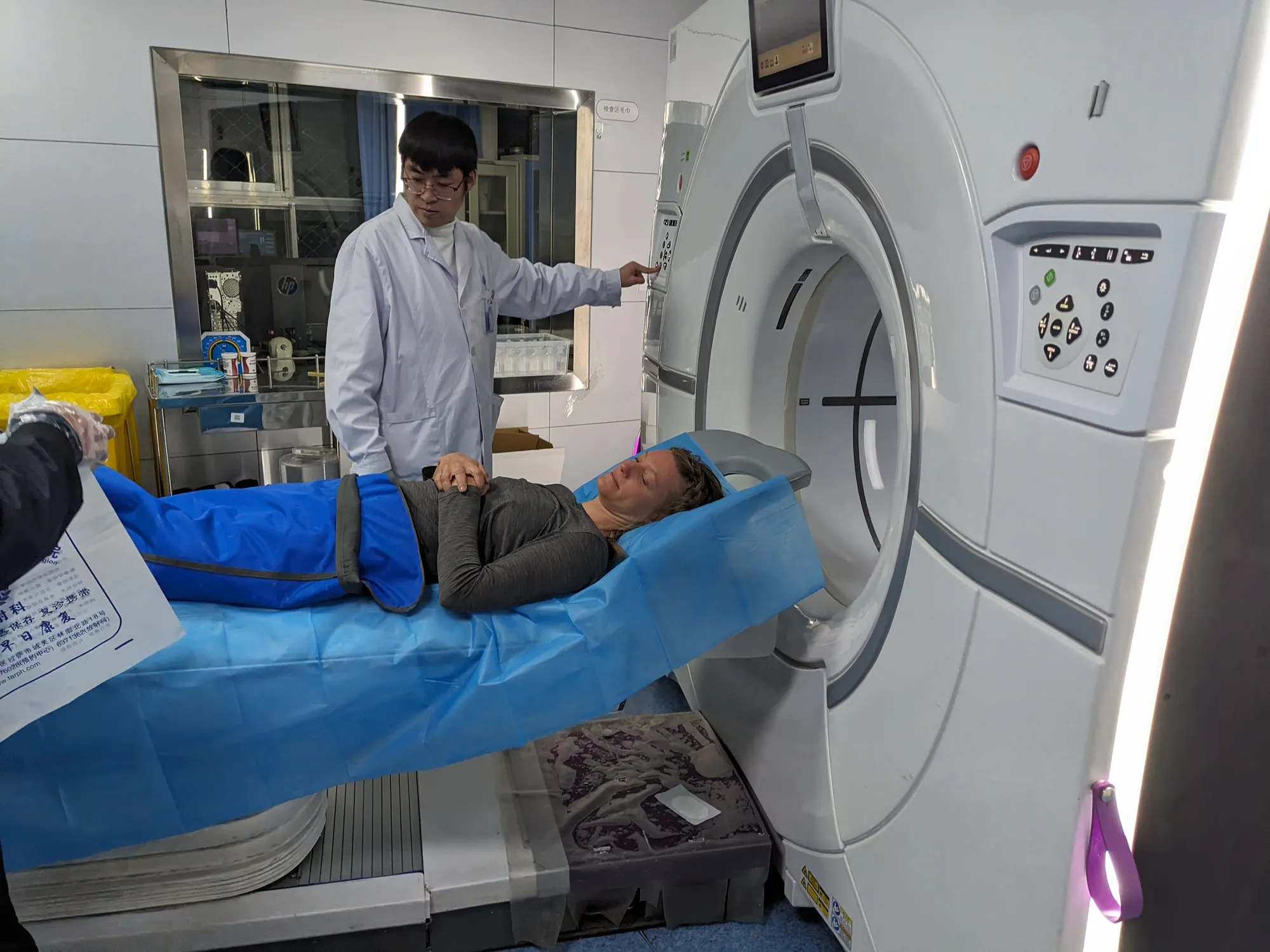 Gegen Ende unserer Woche in Lhasa geht es Nadine immer schlechter. Die Symptome sind vielfältig und unspezifisch: von Fieber über trockenen Husten bis zu hohem Ruhepuls (110). Kurze Spaziergänge lassen den Puls weiter in die Höhe schnellen, und Nadine muss sich hinsetzen. Zu Hause würde man einige Tage ins Bett liegen und abwarten. Wir wollen jedoch weiter in die Höhe und deshalb ausschliessen, dass es sich um die berüchtigte Höhenkrankheit handelt. Im Spital stellt sich heraus, dass auch die Sauerstoffsättigung im Blut sehr tief ist. Die Ärzte diagnostizieren eine Kombination zwischen leichter Höhenkrankheit und Erkältung. Sie raten von einem weiteren Aufstieg ab, bis es Nadine merklich besser geht. So pausieren wir einige Tage in unserem Büssli auf einem Parkplatz und Nadine erholt sich glücklicherweise nach drei Tagen weitestgehend.