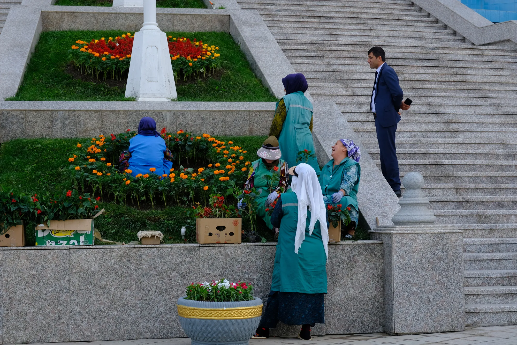 Um uns mit reichlich Lebensmitteln für den bevorstehenden Pamir Highway einzudecken, verlassen wir das ländliche Gebiet und wagen uns nach Duschanbe, der Hauptstadt Tadschikistans. Auch hier wieder könnte der Kontrast kaum grösser sein. Während die Leute in der Bergregion unter einfachsten Bedingungen als Selbstversorger leben oder als Gastarbeiter in Russland ihr Glück versuchen, protzt die Hauptstadt mit riesigen Prunkbauten. Hinter breiten, grünen Boulevards erheben sich sowjetische Plattenbauten, aber auch moderne Hochhäuser. Überall arbeiten Menschen mit Leuchtwesten, welche den Boden wischen oder Strassenrabatten neu bepflanzen. Anders als auf dem Land ist hier alles sauber und gepflegt. Das Budget für den Unterhalt scheint gross, oder die Löhne sind unglaublich niedrig. Auf jeden Fall kann das arme Land für Dinge Geld aufbringen, über wessen Nutzen man streiten kann.