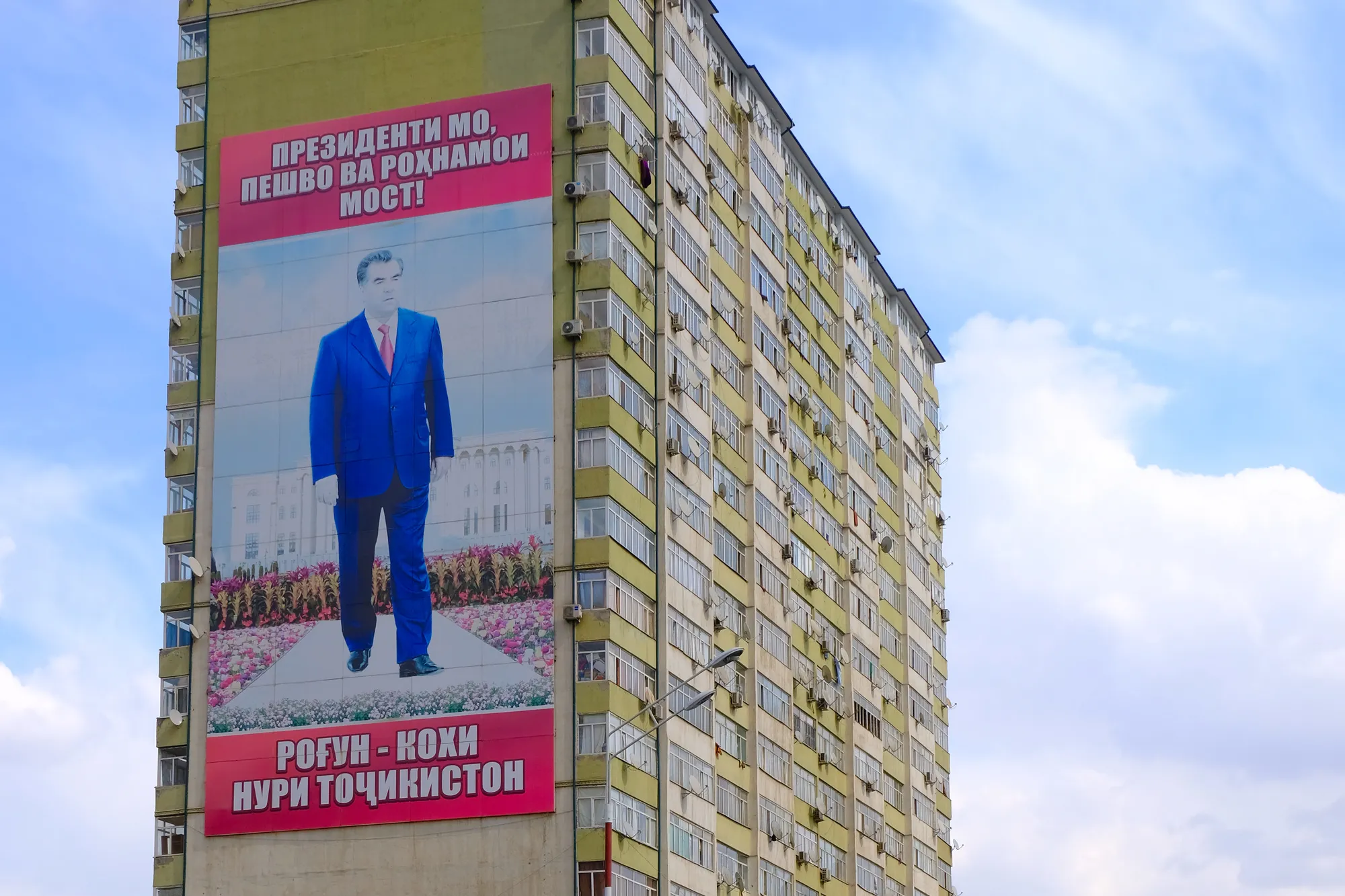Der grosszügige Präsident Emomalji Rahmon begleitet uns nicht nur in Duschanbe, sondern auf unserer gesamten Reise durch Tadschikistan. Auf grossen Plakaten wird er in unterschiedlichsten Inszenierungen gezeigt: einmal mit einem Brot in einem üppigen Getreidefeld, mal mit glücklichen Kindern oder in einem Tulpenmeer vor dem Regierungsgebäude. Wie viel Geld hier wohl jährlich für die Werbekampagne des Präsidenten ausgegeben wird?