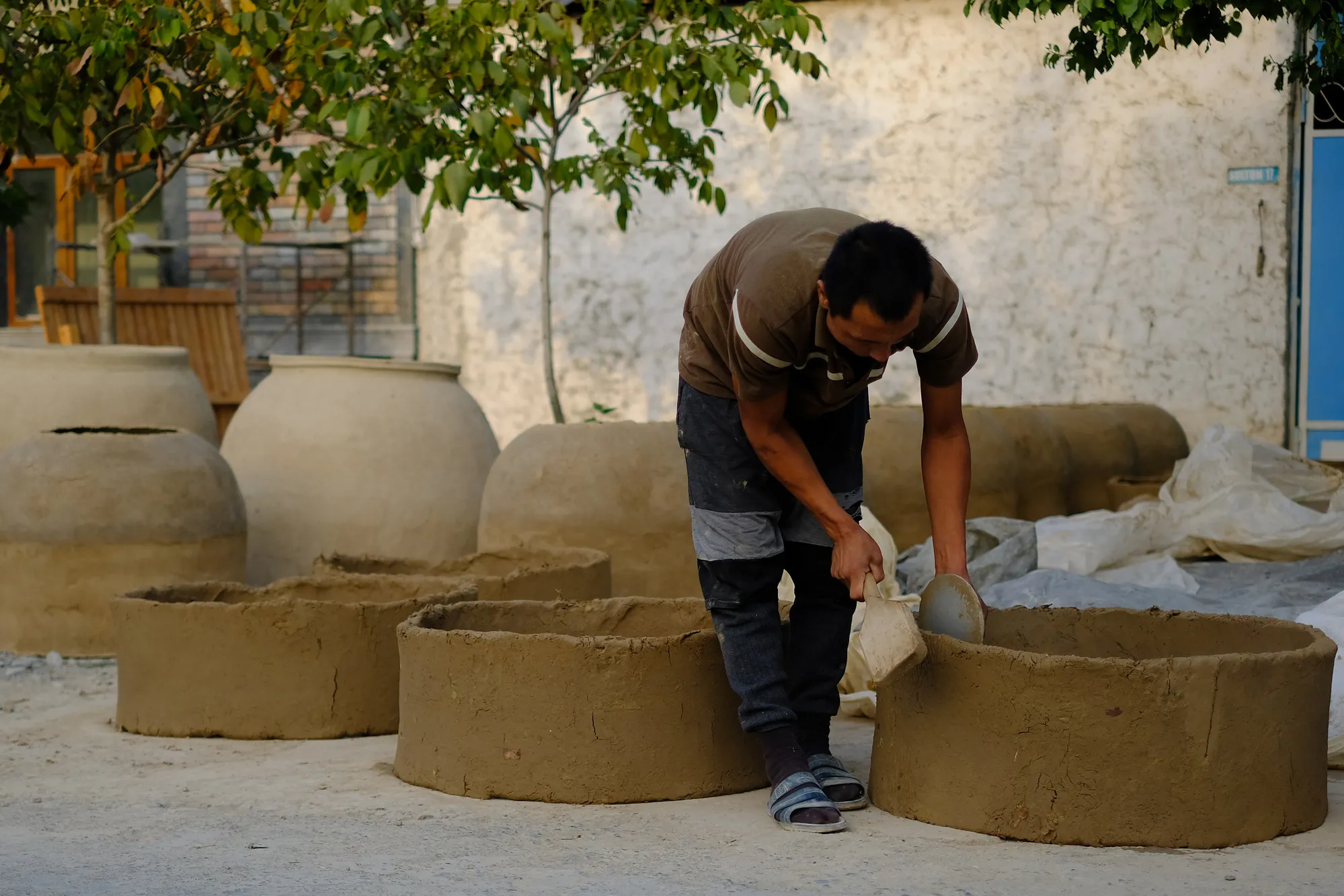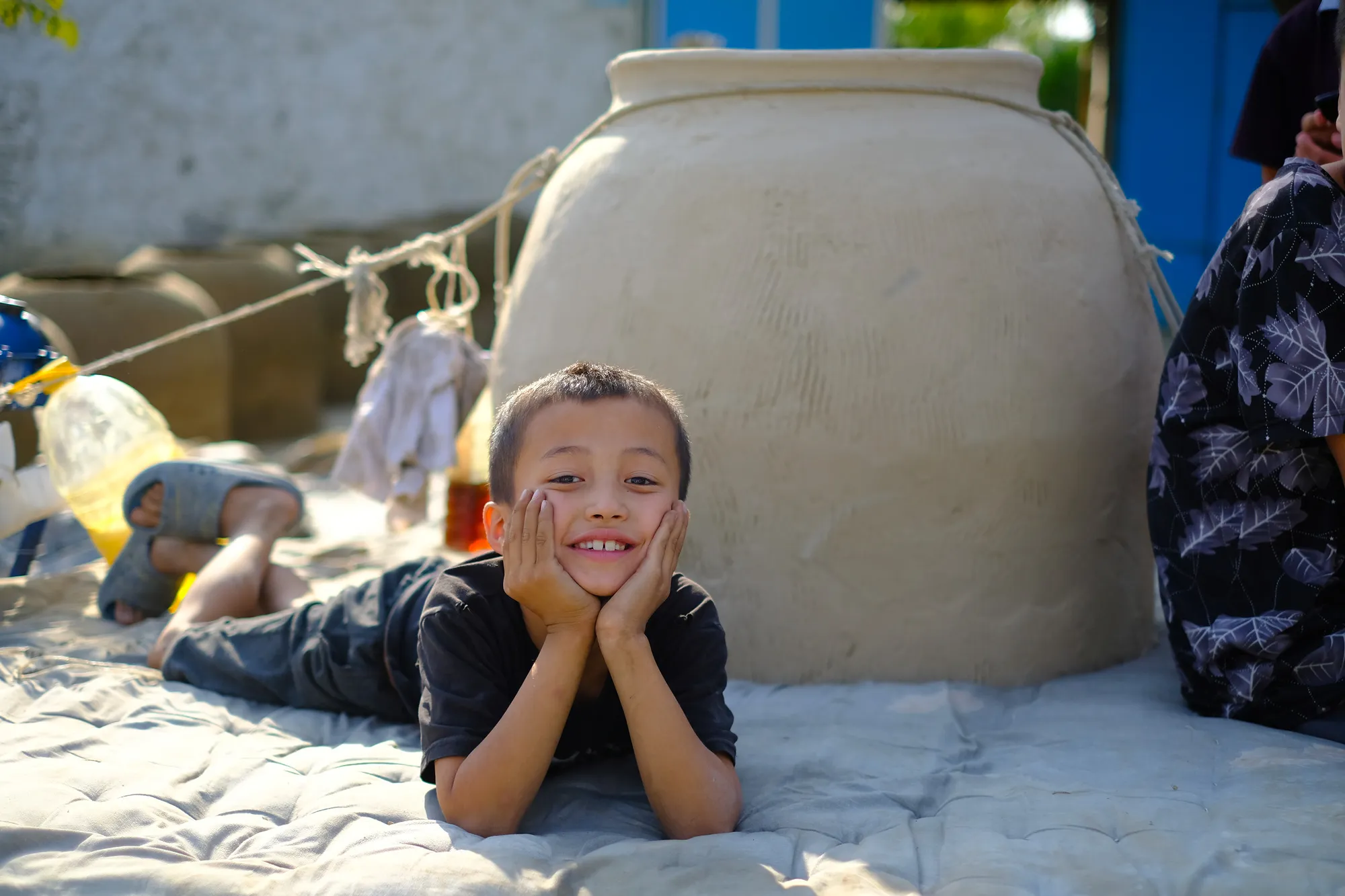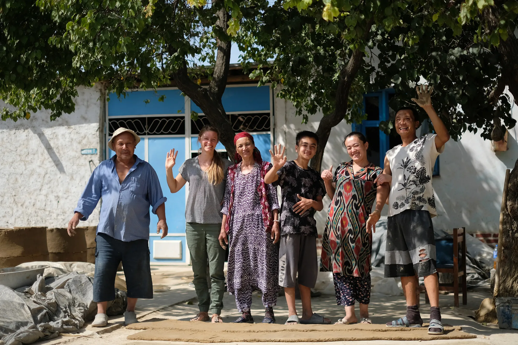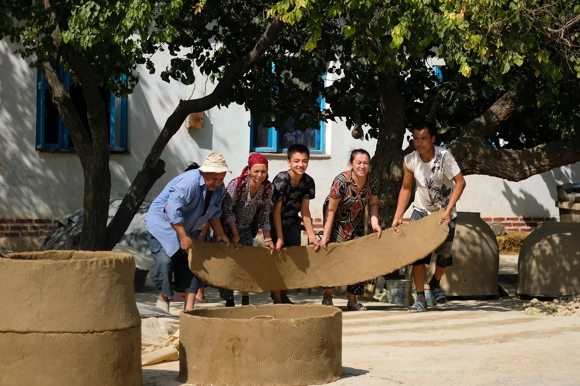 Azim und seine Familie stellen in aufwändiger Handarbeit traditionelle Tandur-Ofen her, welchen man in Usbekistan an fast jeder Strassenecke begegnet. «Um dem gesamten Produktionsprozess beiwohnen zu können, müsst ihr mindestens zwei Tage hier bleiben», übersetzt Zakhro, die Nachbarin. Wir haben Lust, vertiefter in die Kultur einzutauchen und nehmen die Einladung dankend an.