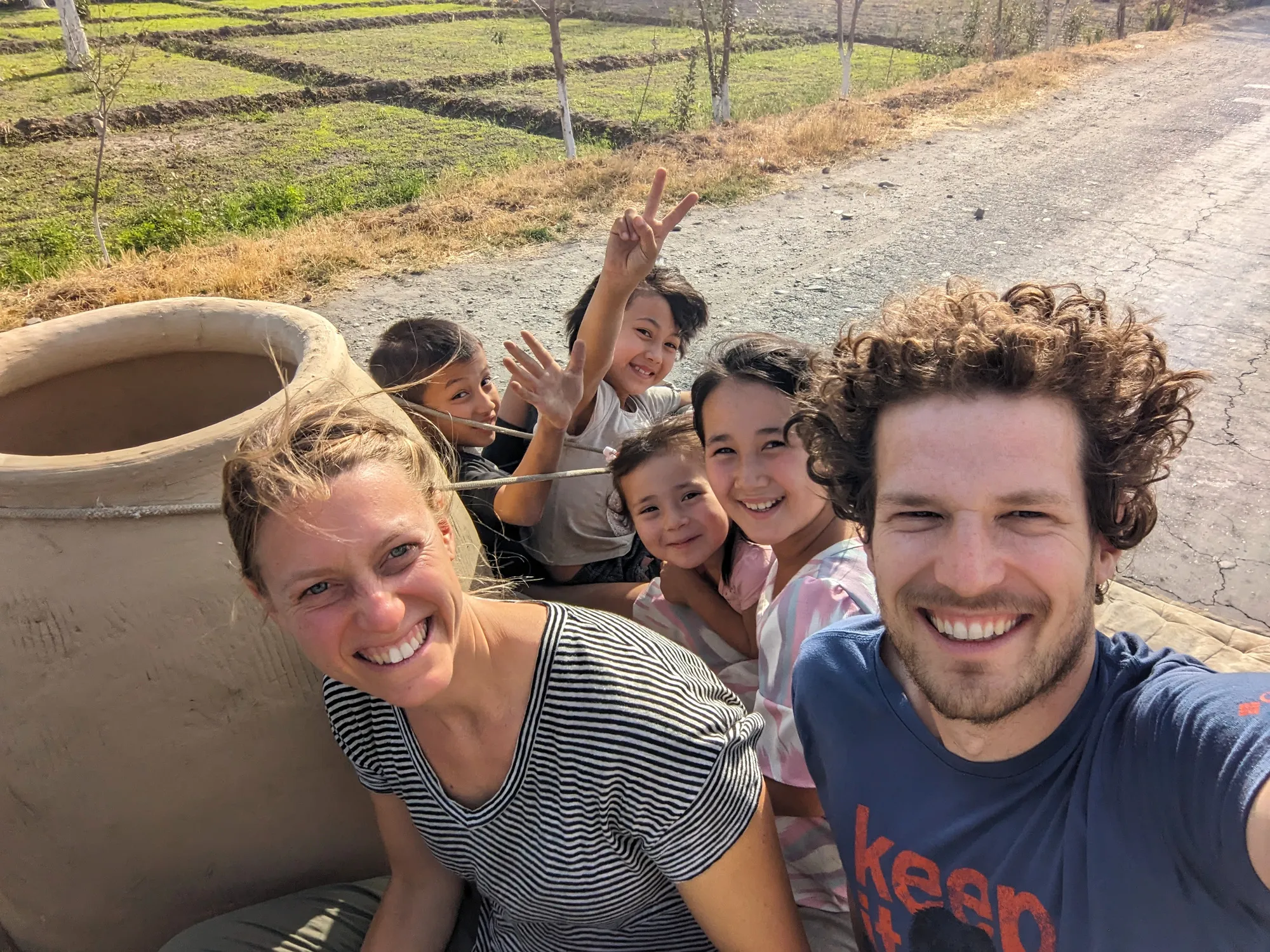 Dank den Tandur-Ofen, welche vor dem einfachen Lehmhaus stehen, wissen wir, dass wir hier richtig sein müssen. Vorsichtig treten wir in den Innenhof, wo uns ein paar neugierige Kinder und eine ältere Frau entgegen kommen. «Salam alaikum!», grüssen wir und zeigen etwas unsicher die Fotos, welche uns Tonja und Milan geschickt haben. Die alte Frau lächelt und winkt uns ins Haus, wo sich bald schon die ganze Familie zum Tee um uns versammelt. Sie begrüssen uns, als wären wir alte Bekannte, schenken uns Tee ein und beugen sich interessiert über die Fotos, welche wir ihnen zeigen. Azim, der Familienvater lacht und deutet auf Janosch’s Haar, welches um einiges länger ist als jenes von Milan auf dem Foto. Erst jetzt realisierten wir, dass sie uns für das Schweizer Pärchen halten, welches sie vor zwei Jahren kennen gelernt haben.