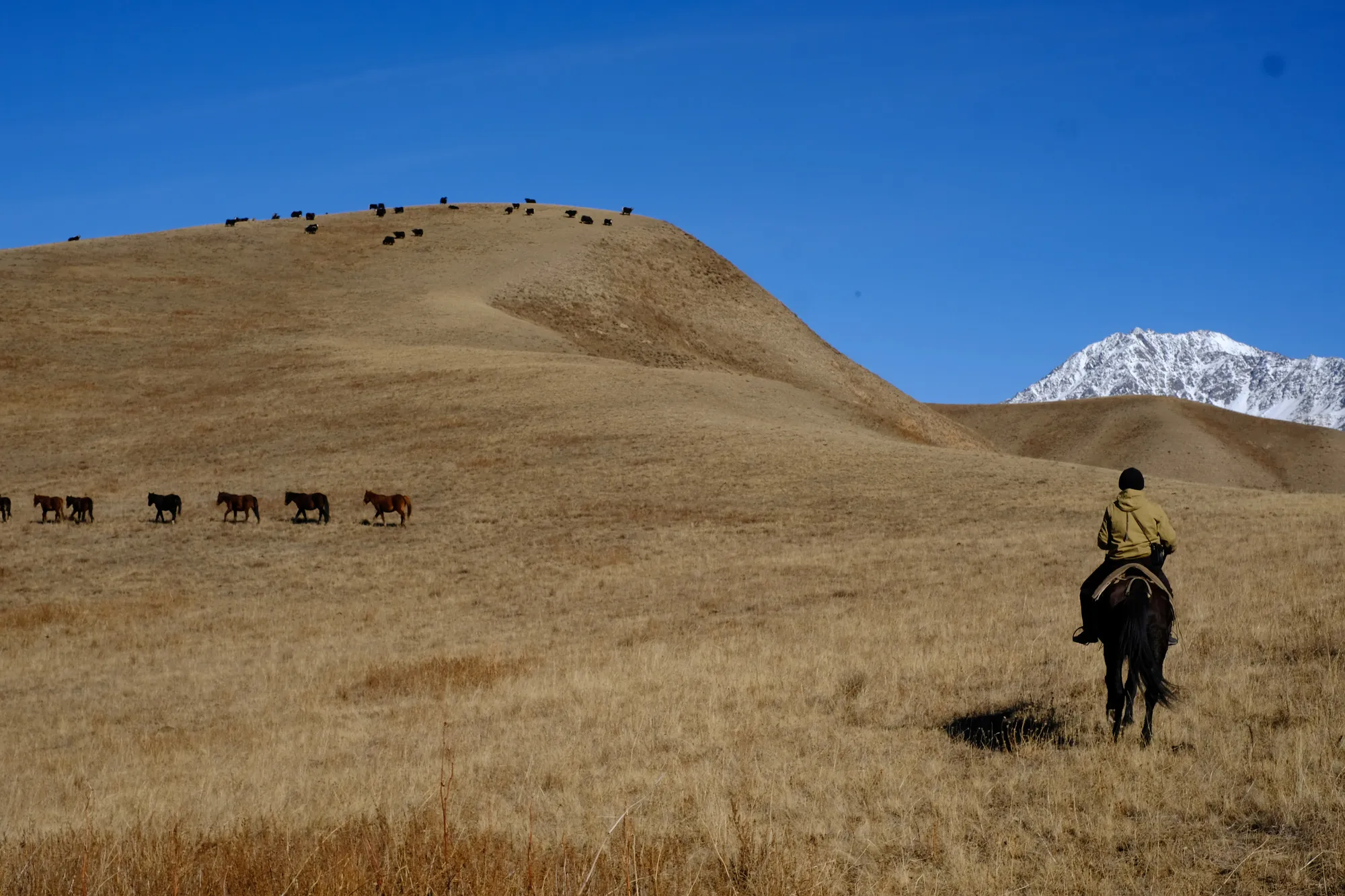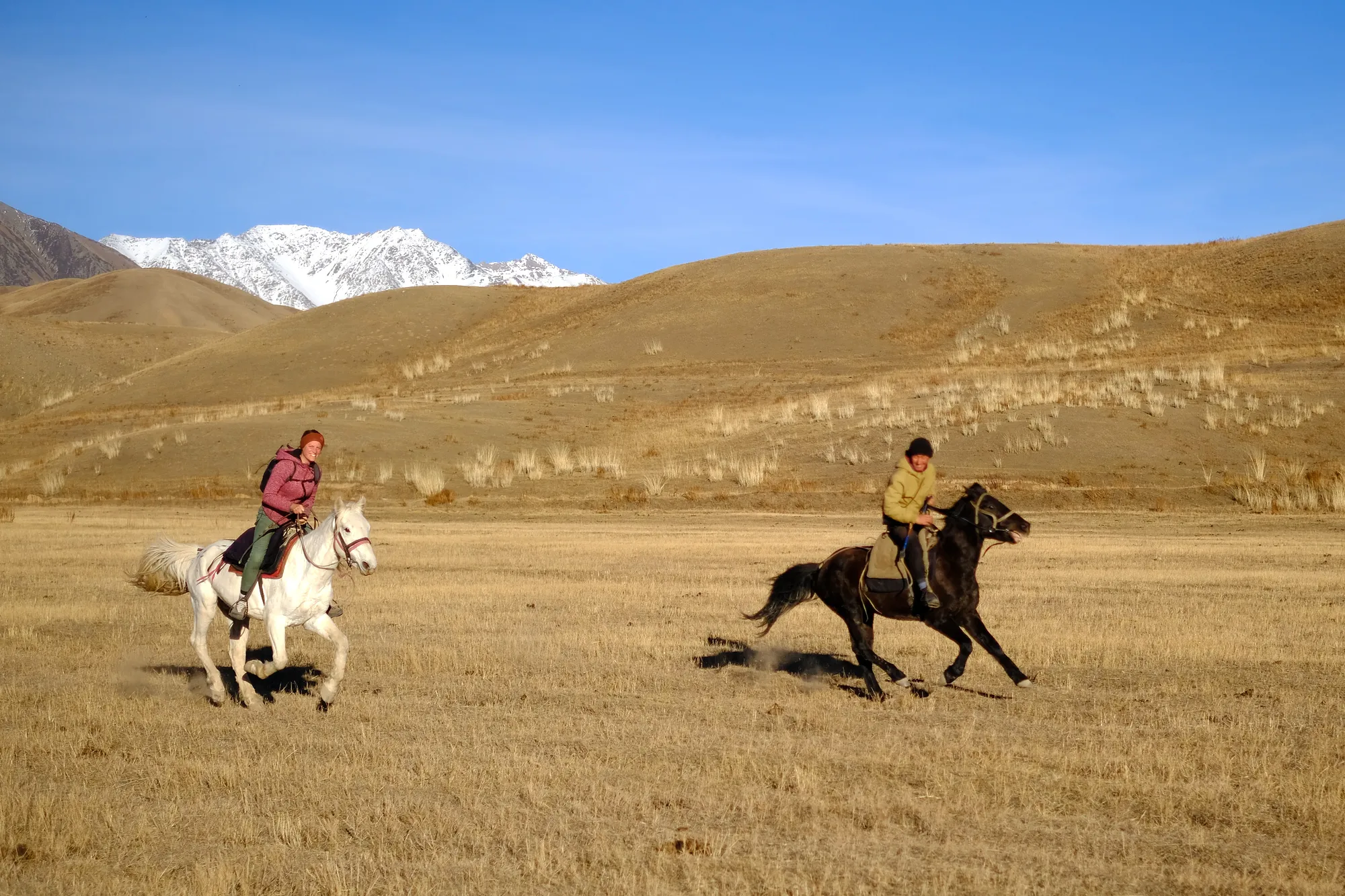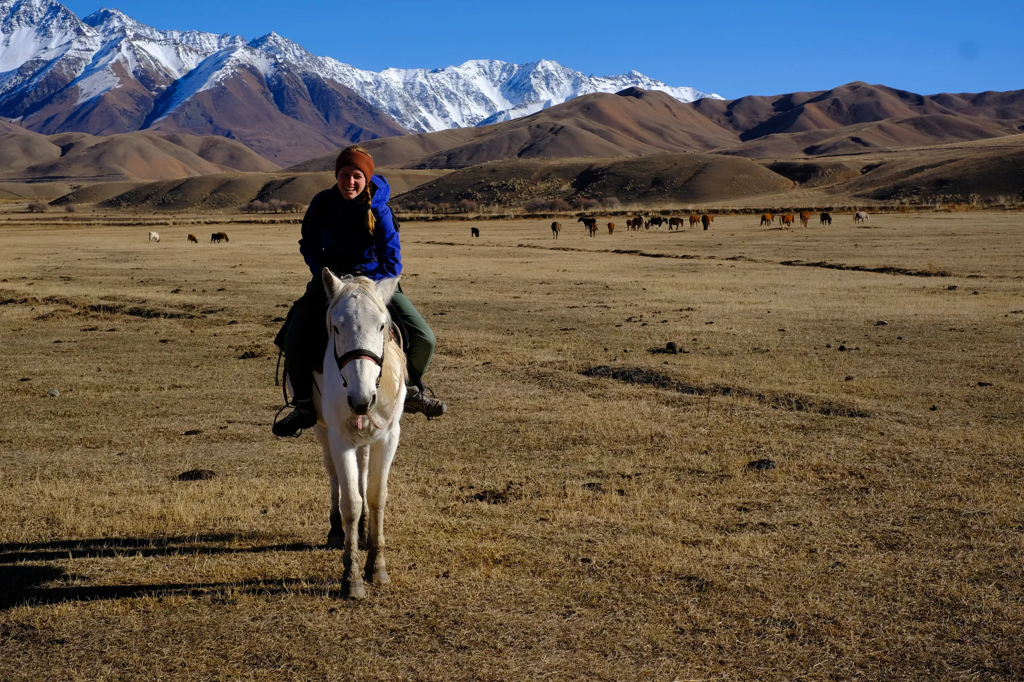 Die Vorbereitungen für China nehmen viel Zeit ein. Und doch möchten wir die beindruckenden Landschaften Kirgistans nochmals bewusst geniessen können. Da uns der Pferdetrekking in Arslanbob unglaublich gut gefallen hat, organisieren wir eine weitere Tagestour nahe Naryn. Ein lokaler Guide kennt die schönsten Orte. Und so passieren wir halbwilde Yak- und Pferdeherden, erklimmen die aussichtsreichsten Hügel und galoppieren durch breite Flusstäler. Mittagessen oder Wasser hat Ula, unser Guide, nicht dabei. Stattdessen versteckt er unter seiner Jacke eine grosse Vodkaflasche, welche sich bis zum Ende der Tour allmählich leert. Reiten wir an einer einfachen Hirtenhütte vorbei, legen wir eine Pause ein. Ula scheint alle zu kenne, weshalb wir gleich zweimal zum Tee eingeladen werden und neben der Natur unverfälschte Einblicke in das Alltagsleben der Menschen hier erhalten.