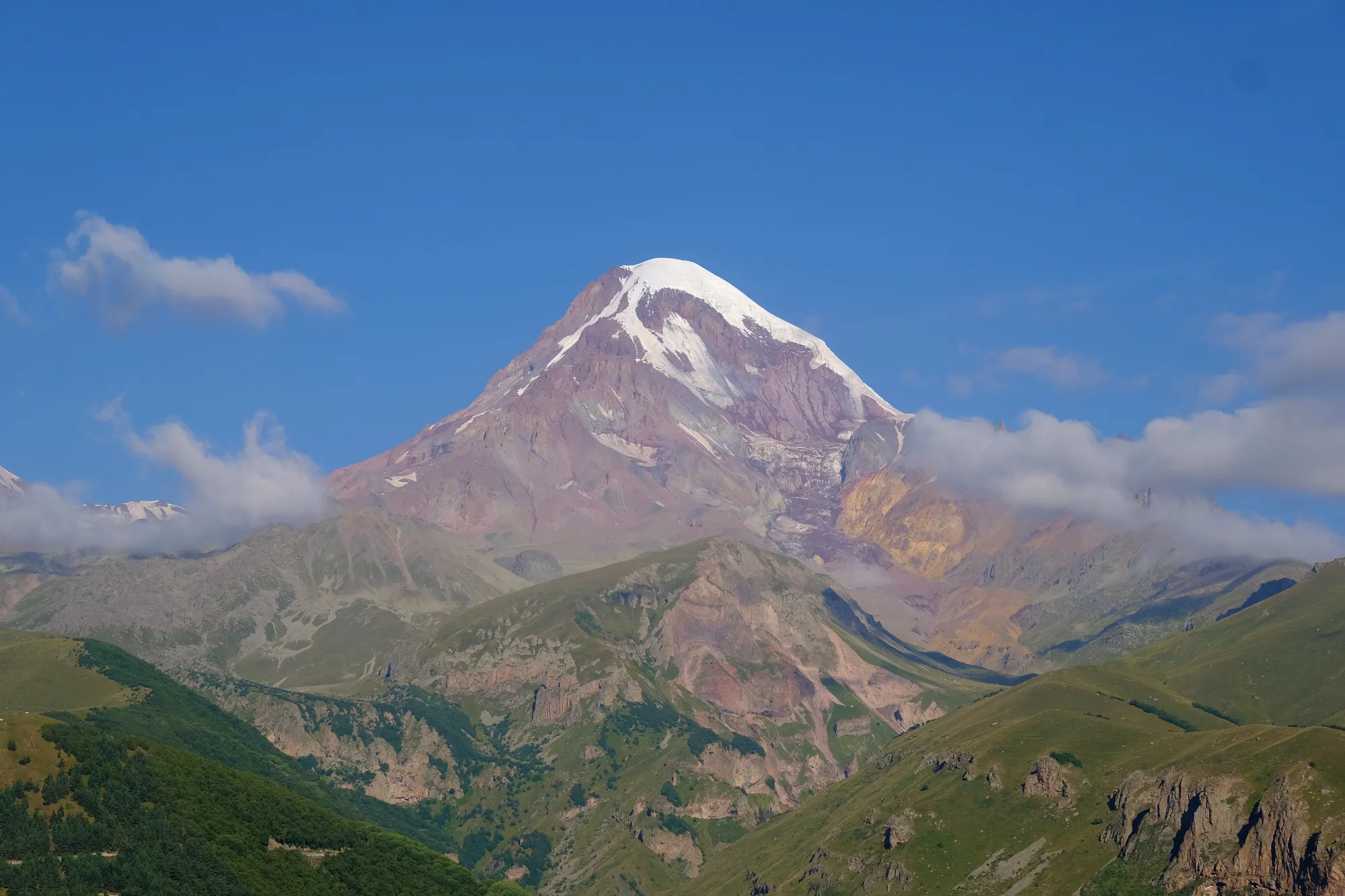 Auf der Wetter-App meteoblue erblicken wir ein günstiges Wetterfenster zur Besteigung des Kazbek (5’054 müM). So machen wir uns gleich tags darauf auf den Weg mit einem voll gepackten Rucksack, in dem sich Platz für die Hochtourenausrüstung, Zelt, Schlafsack, Kocher und Essen für 4 Tage findet. Beim Zustieg am ersten Tag passieren wir eine sehr gemütliche Hütte, die nicht nur wegen der vielen Schweizer Plakate (Jungfrau, Rigi, Matterhorn, …) an eine SAC Hütte erinnert; es stellt sich heraus, dass diese von einem schweizer Holzbau-Unternehmen eigenhändig gebaut wurde.