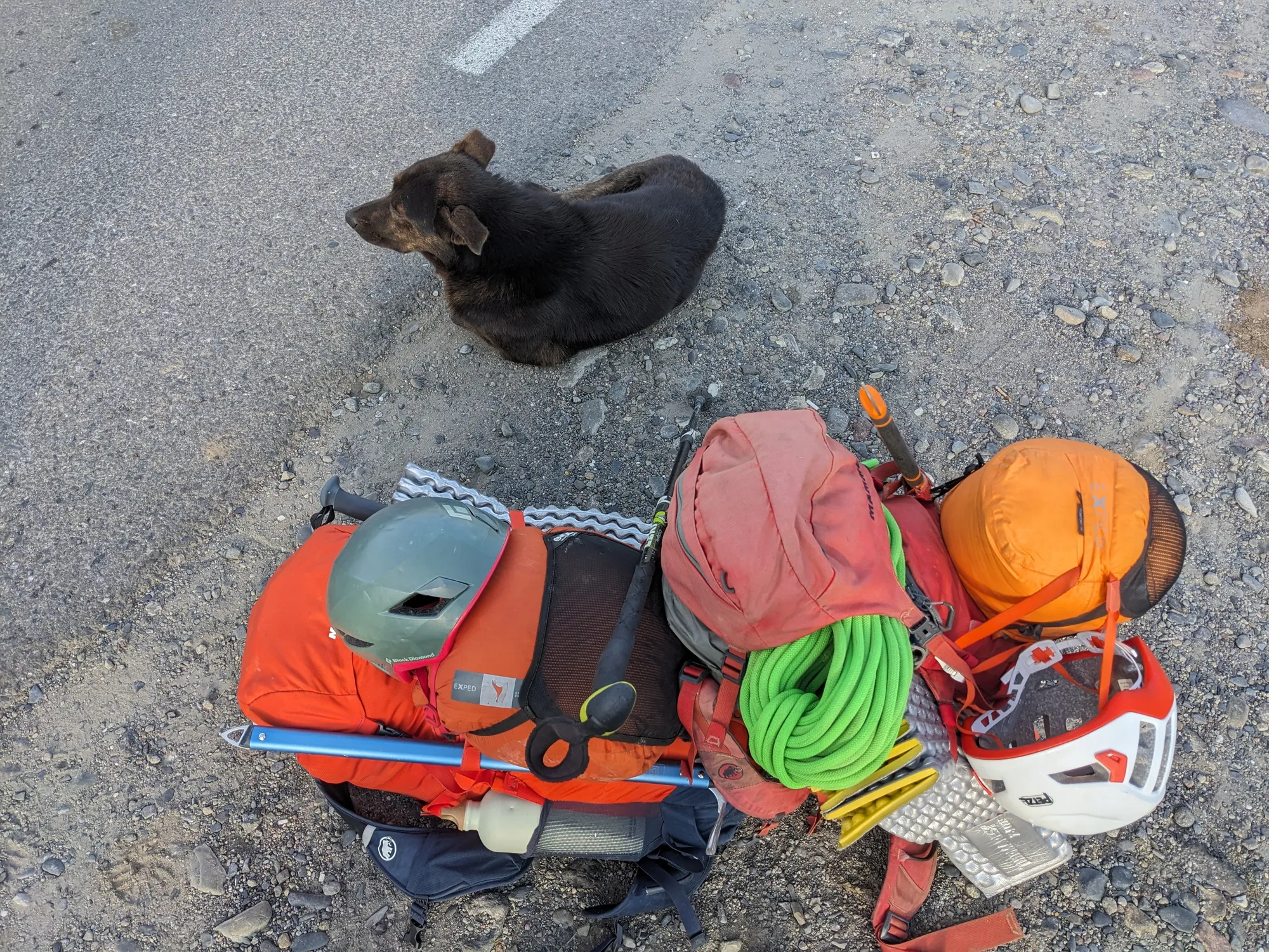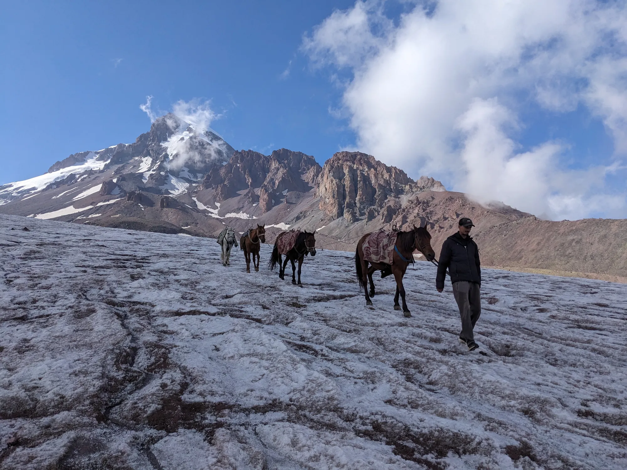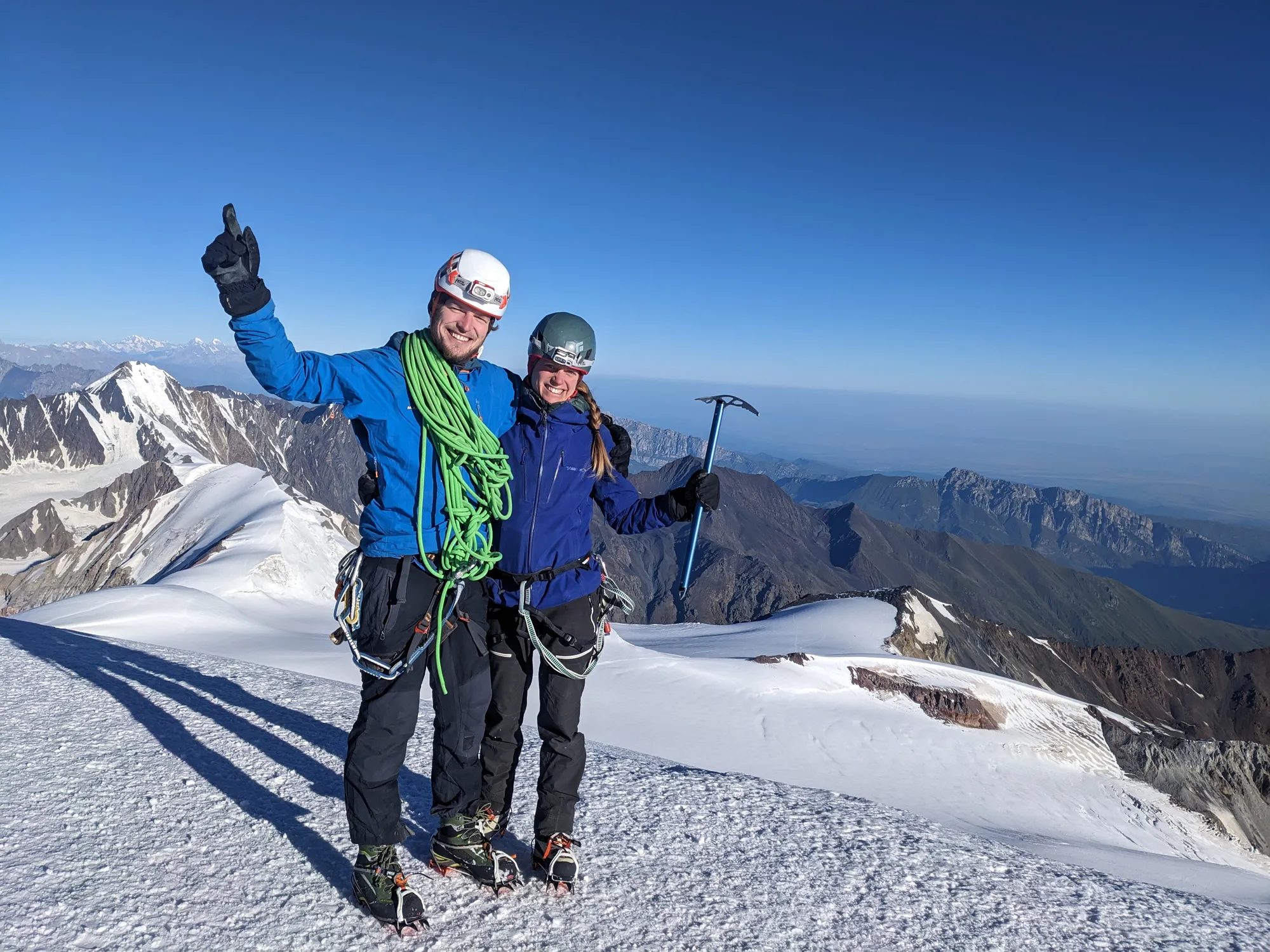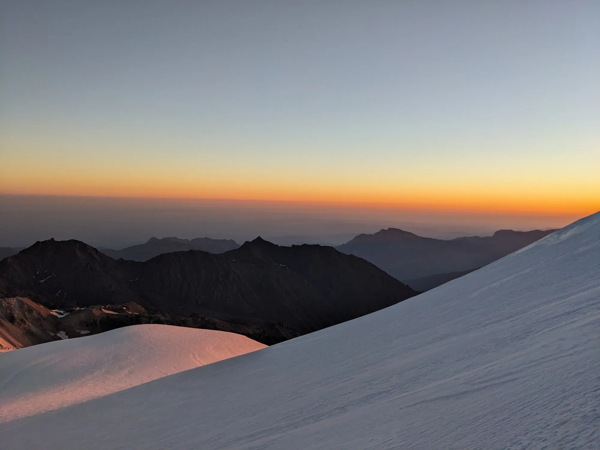Um 02:45 Uhr machen wir uns mit Stirnlampen auf den Weg und überholen in gefühlt gemächlichem Tempo bereits vor dem Gletscher 3 Seilschaften. Wir fühlen uns beide ziemlich fit, finden den Weg auch im Dunkeln ziemlich problemlos und sind bei Sonnenaufgang kurz vor dem Gipfel. Der letzte Teil ist denn auch die “Schlüsselstelle” der Tour; ein ca. 40 Grad steiles Eisfeld gilt es zu überwinden. Ohne perfekt ins Eis geschlagene Spur wäre dies eine ziemlich interessante Stelle geworden mit leichter Eiskletterei in ca. 2 Seillängen. Aber so steigen wir gemächlich Schritt für Schritt in der Spur die letzten Meter hoch zu unserem höchsten bisher bestiegenen Gipfel. Dank unserer Geschwindigkeit haben wir den Gipfel einige Zeit für uns alleine. Wir könnten die unglaubliche Rundumsicht noch viel länger geniessen, steigen dann aber aufgrund der Kälte wieder ab. Um 11:00 sind wir zurück beim Zelt, und entscheiden uns bereits heute - einen Tag früher als geplant - ins Dorf abzusteigen. Während des langen Abstieges freuen wir uns auf das bequeme Bett im Büssli - und schlafen dann glatt 12 Stunden durch.