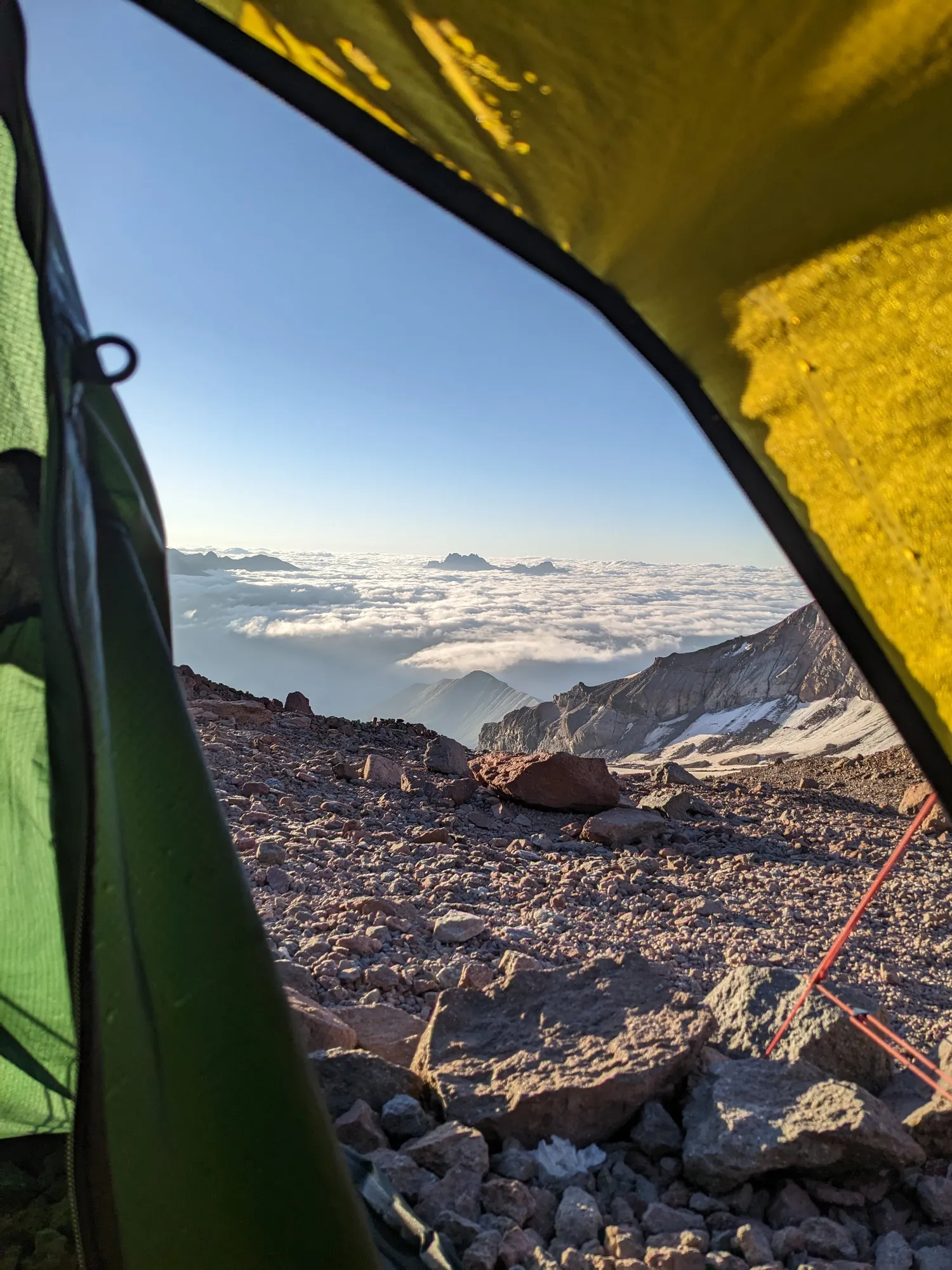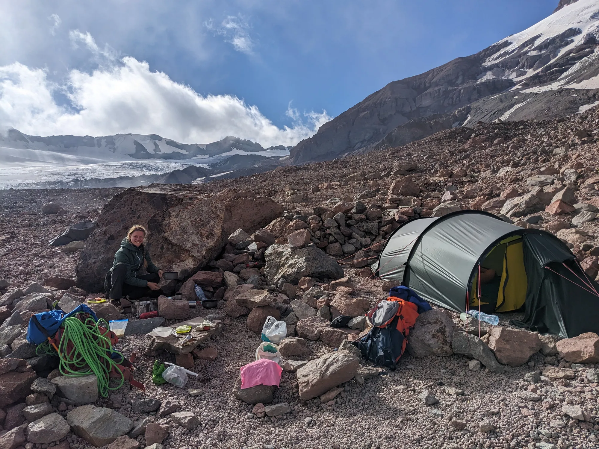 Da diese Hütte jedoch zu weit unten liegt, ist eine Übernachtung im Zelt näher am Gipfel unerlässlich. Müde errichten wir am ersten Abend unser “Basislager” auf 3’850 müM. Den zweiten Tag nutzen wir zur Akklimatisierung und steigen bis auf 4’400 müM auf. Da wir bereits wieder am Mittag zurück bei unserem Basislager sind, haben wir Nachmittags Zeit für Repetition: Spaltenrettung & der doppelte Flaschenzug stehen auf dem Programm. Kurz darauf kochen wir unser Abendessen, damit wir um 18:00 Uhr in den Schlafsack kriechen können. Erstaunlicherweise schlafen wir bald ein, und wachen doch ziemlich erholt mit dem Wecker um 02:00 auf.