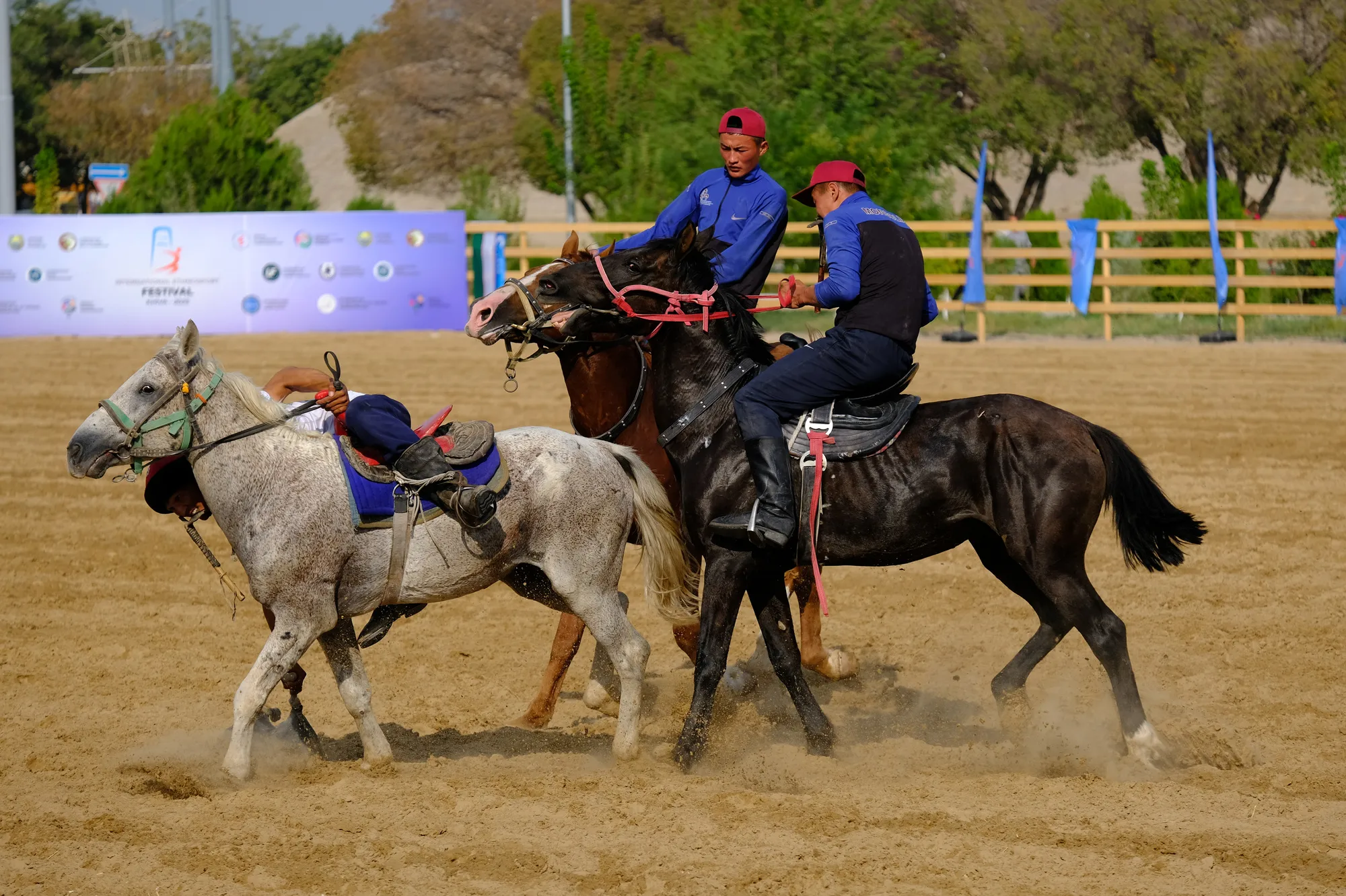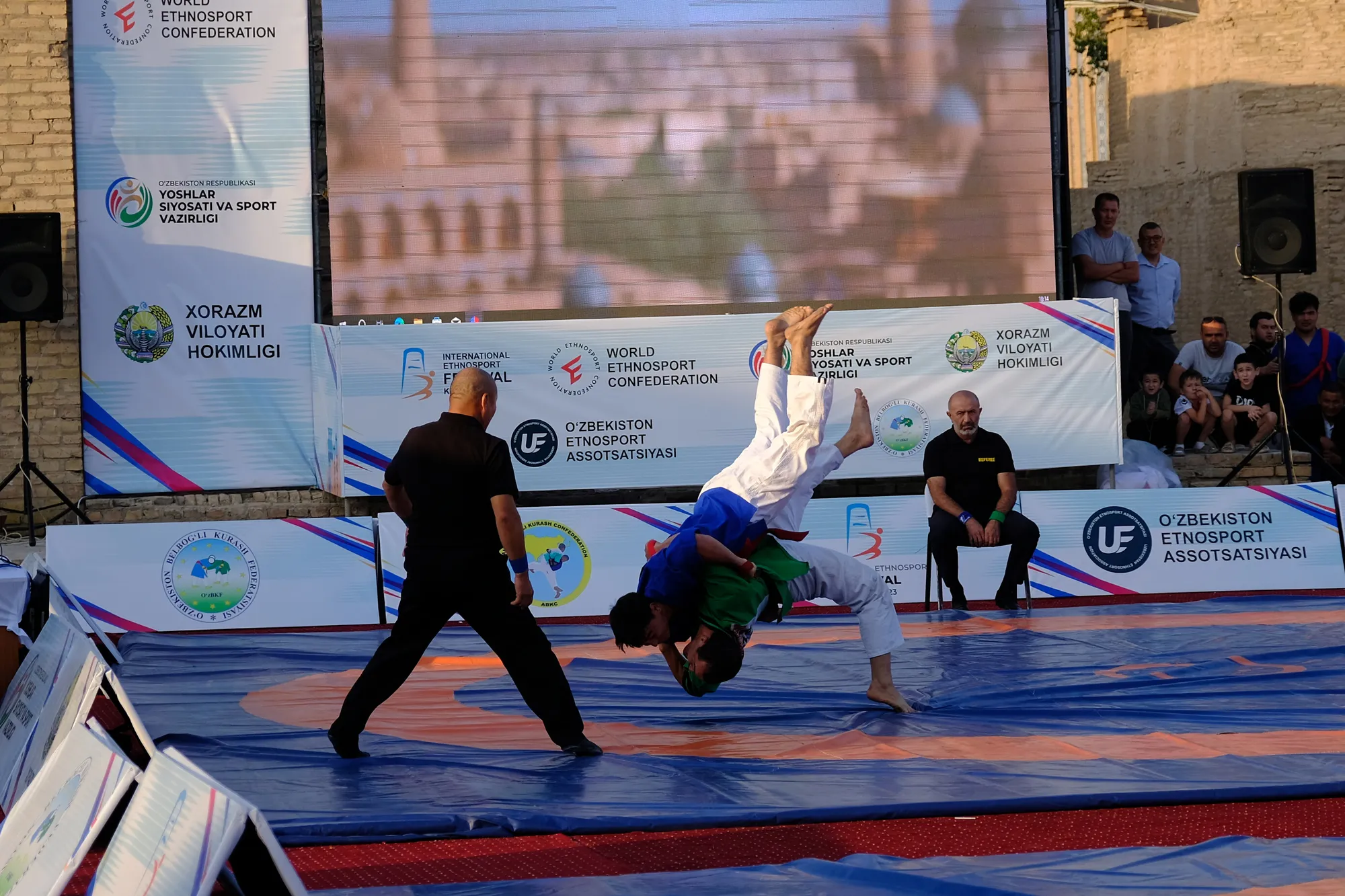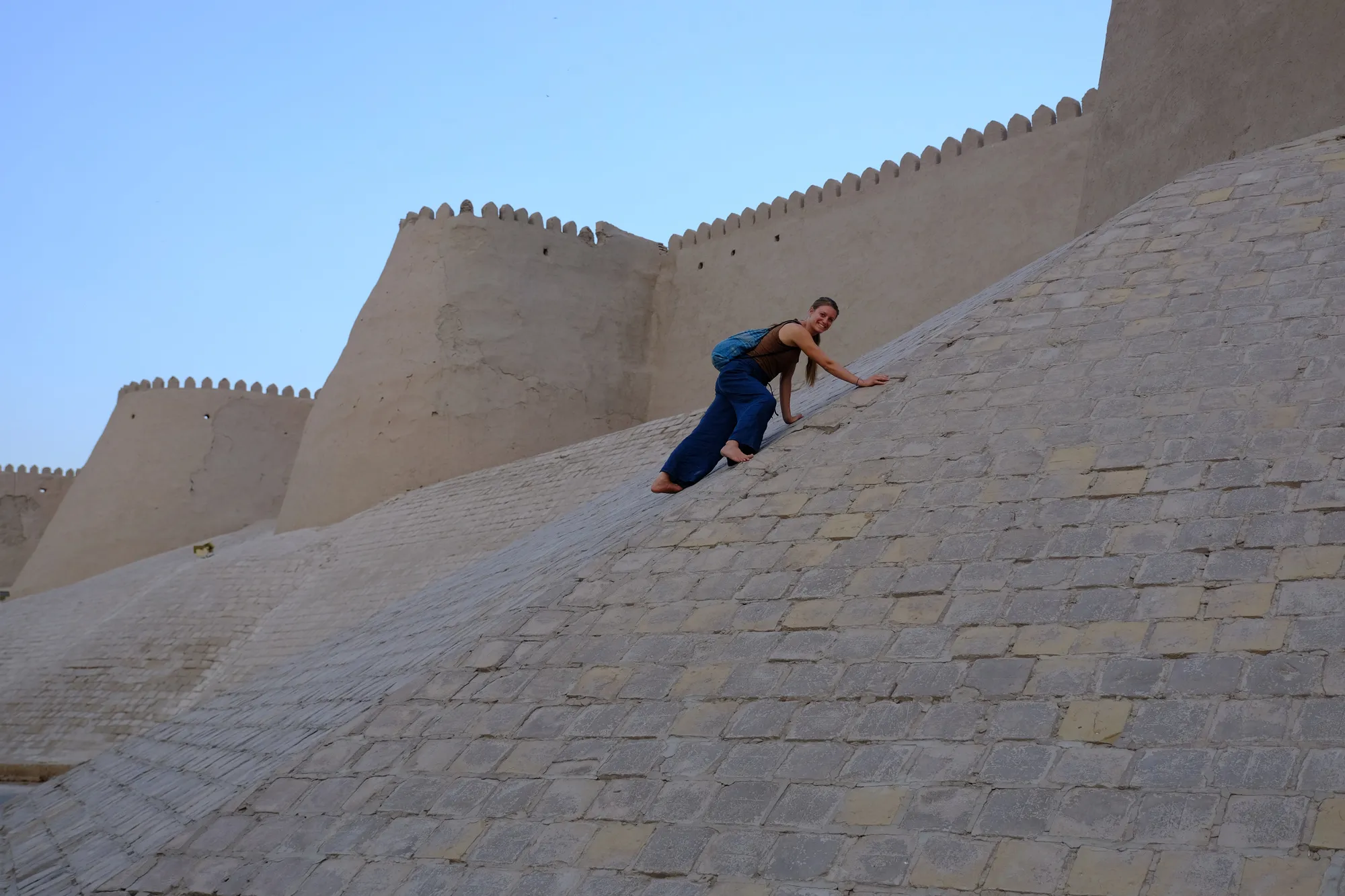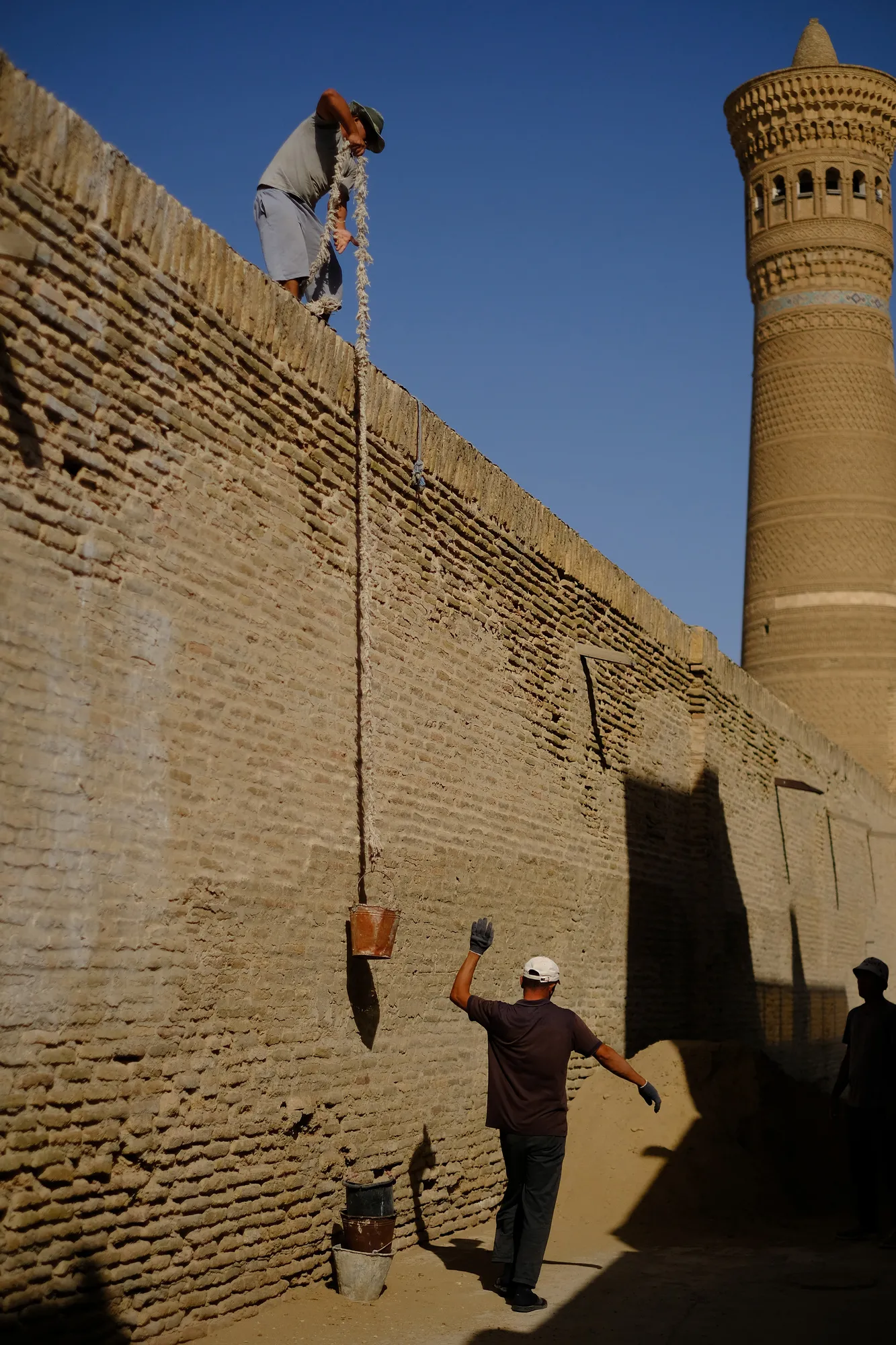 Khiva, im Westen, fühlt sich wie ein begehbares Museum an. Die alten, restaurierten Bauten liegen dicht beieinander und bilden einen etwa 400x400 Meter grossen Stadtkern. Dieser ist umgeben von einer Stadtmauer und ist, bis auf einige Touristen in Hotels, nicht mehr bewohnt. So ist die Stadt nachts menschenleer und füllt sich am Morgen rasant mit Besuchern. Zufälligerweise überlappt sich unser Besuch mit der Austragung des internationalen Ethnosport Festivals. Von Wettkämpfen hoch zu Ross, diversen Künstler auf der Strasse bis zu Ringen wird einiges geboten.
