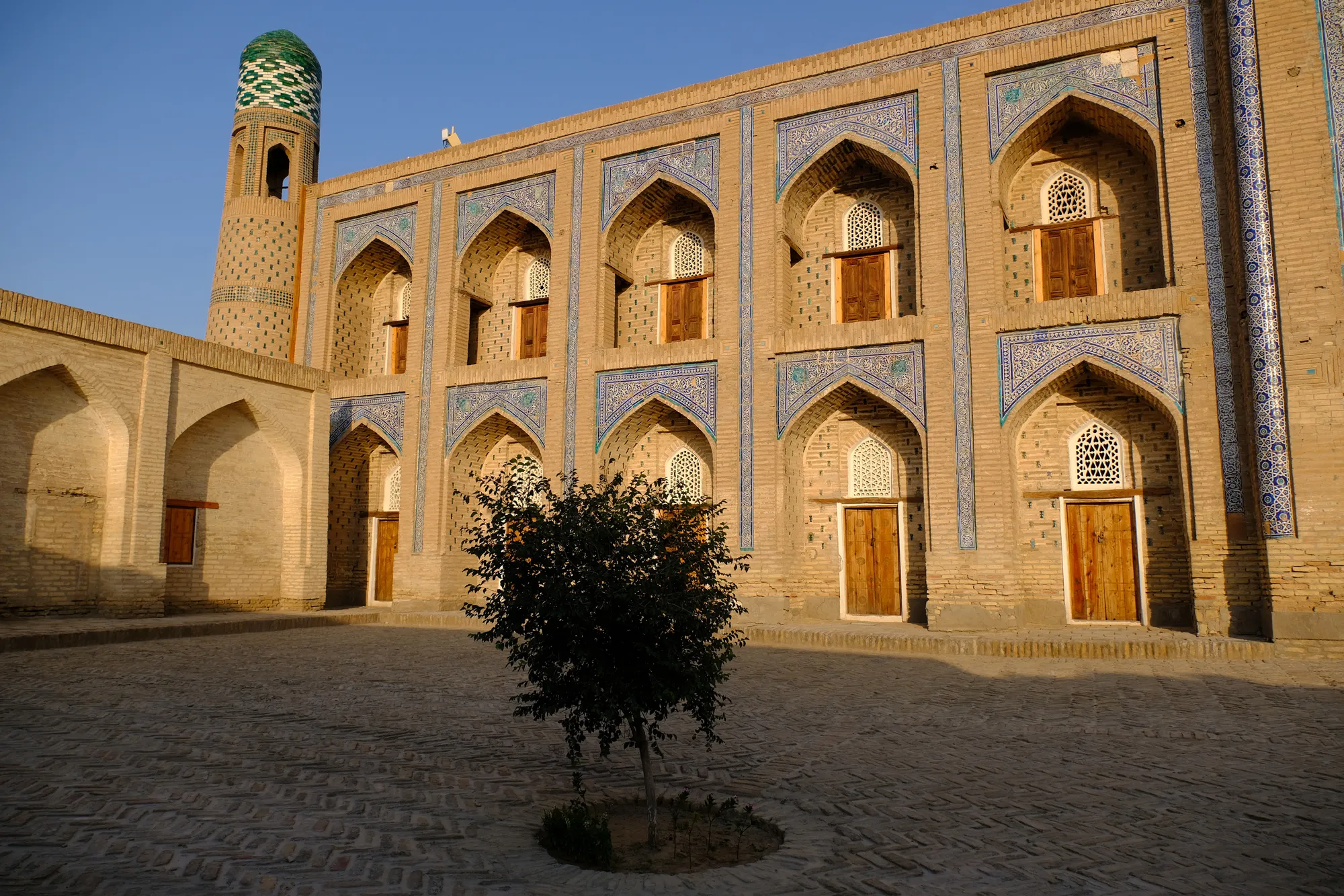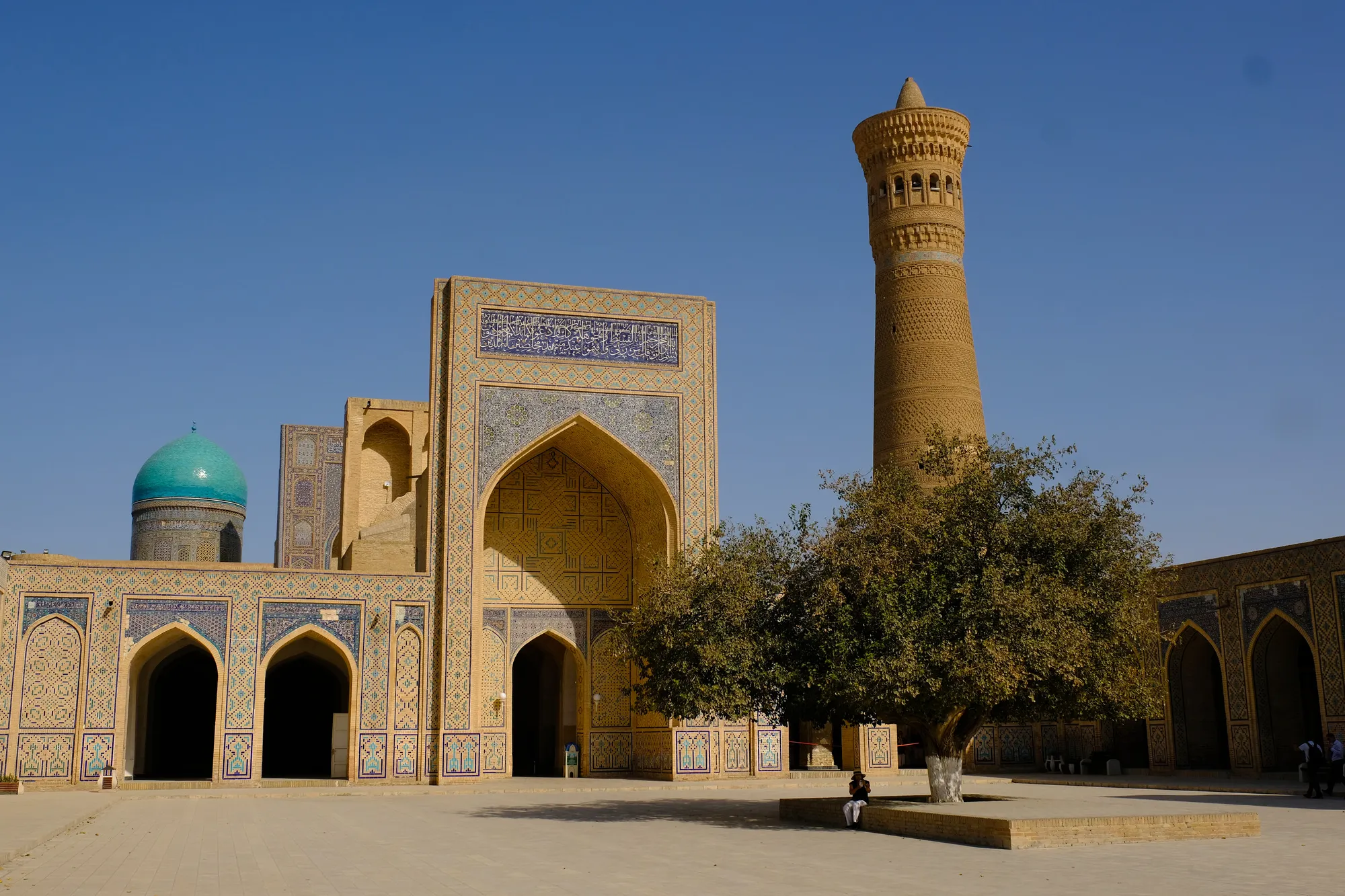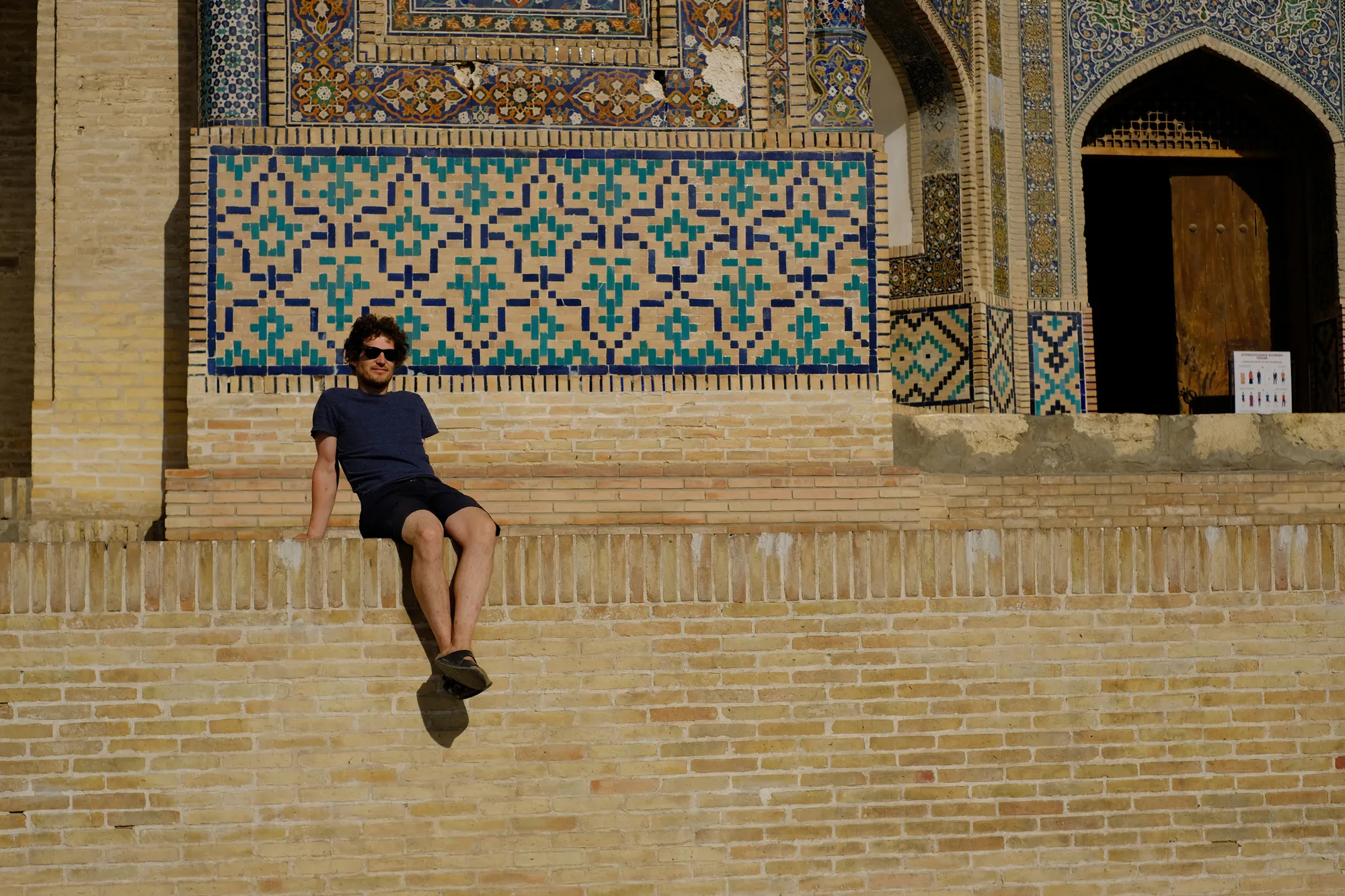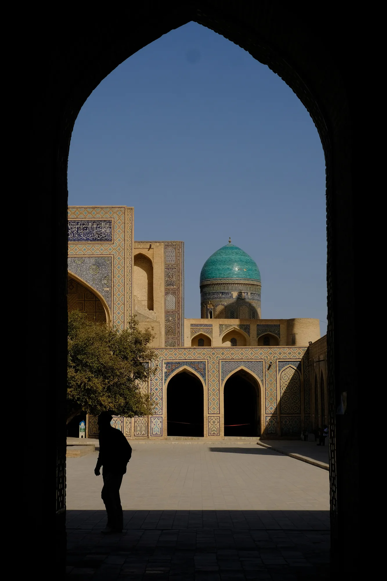 Buchara. Die Altstadt ist ziemlich gross und der Übergang zu den modernen Vierteln fliessend. Der Stadtkern besteht aus unzähligen Sandsteingebäuden, die bis heute bewohnt sind, sowie vielen Sehenswürdigkeiten wie Moscheen, Türmen oder Medresen. In den verwinkelten Gassen fühlt man sich um mehrere Jahrhunderte zurückversetzt, bis man wieder einem kleinen Motorrad begegnet, dass sich durchschlängelt. Beeindruckt sind wir von den grossen grünen Innenhöfen und den wunderschön mit Mosaik verzierten Medresen. In diesen Koranschulen/Universitäten lebten und lernten teils Hunderte Studenten und deren Dozenten.