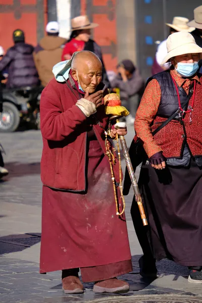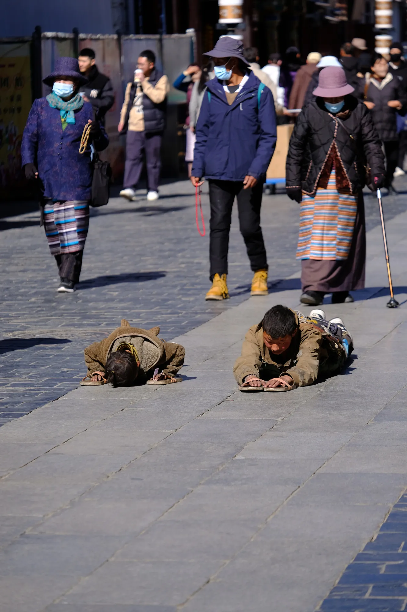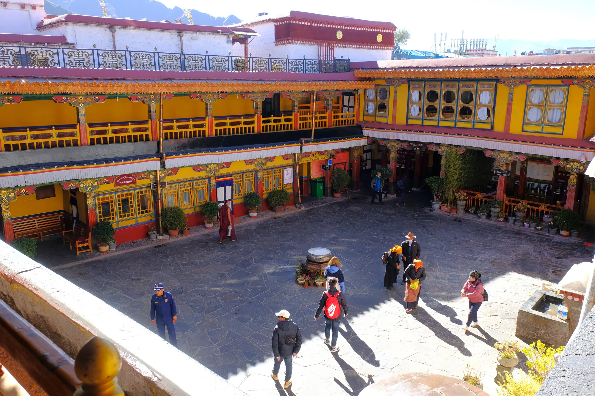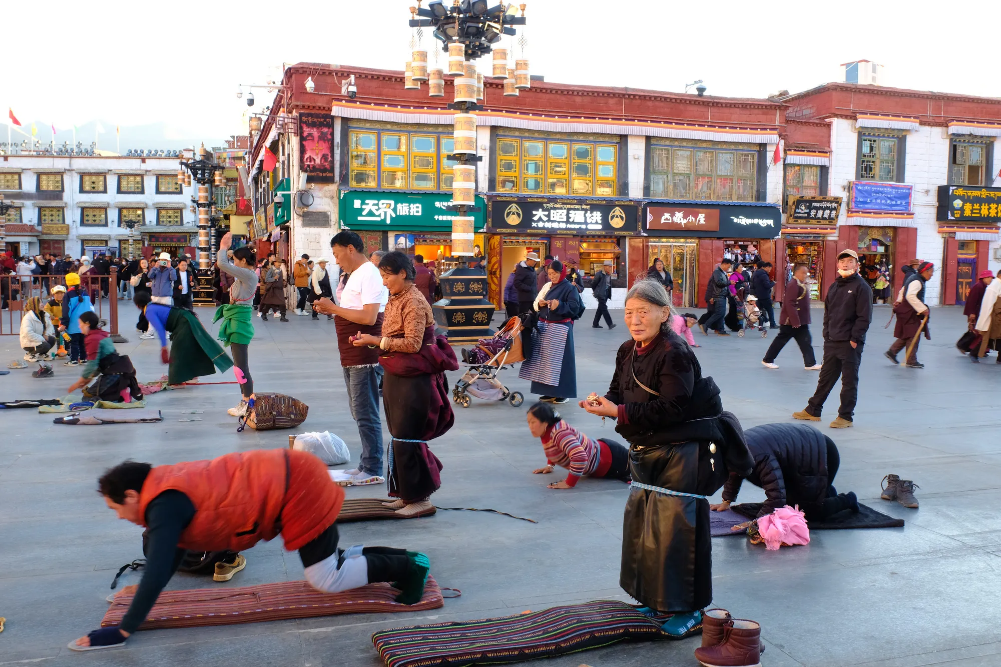 Mit dem Jokhang-Tempel besuchen wir anschliessend die wichtigste Pilgerstätte des Landes. Was Mekka für Muslime ist, stellt der Jokhang für tibetische Buddhisten dar. Pilger strömen aus dem ganzen Land nach Lhasa, um den Tempel aufzusuchen und in einer Kora zu umrunden. Dabei murmeln sie Mantras und werfen sich immer wieder zu Boden.